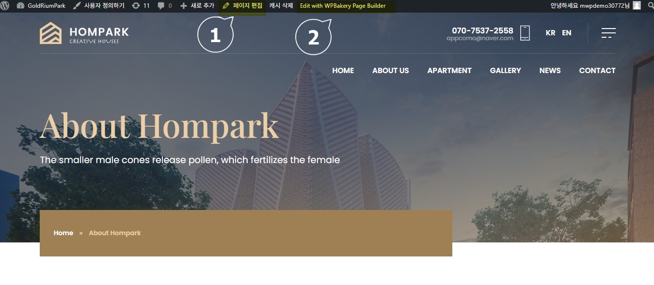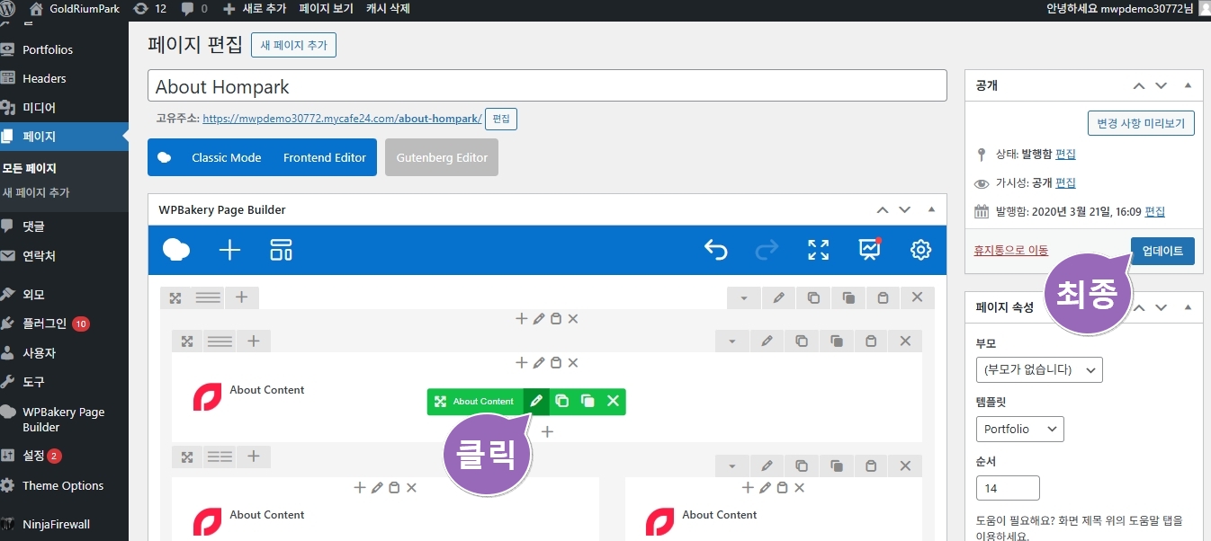 편집하고자 하는 페이지로 이동 후 상단의 페이지편집 또는 WPBakery Builder 편집하기를 클릭합니다.